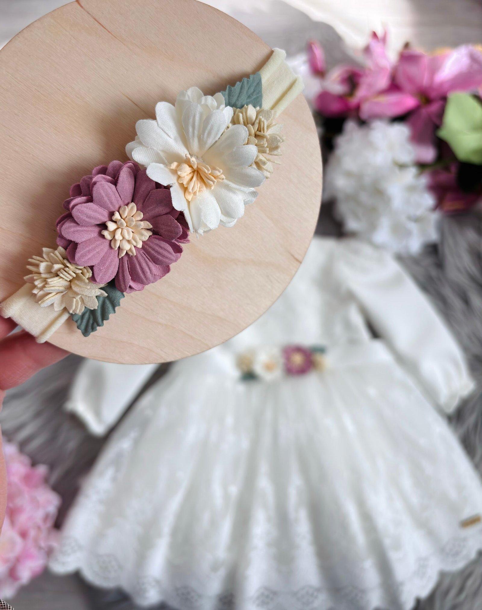 Opaska z kwiatuszkami na bezuciskowej tasiemce. Kwiatuszki s膮 papierowe oraz z mi臋kkich tkanin.