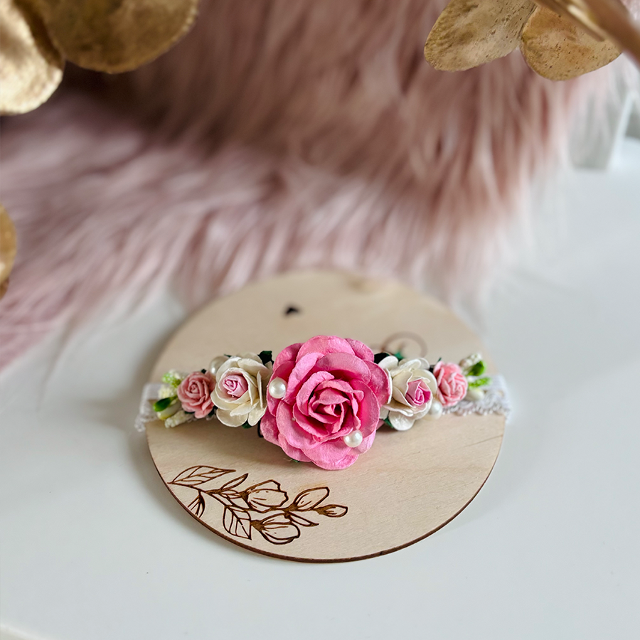 Piękna opaska z kwiatuszkami na koronkowej tasiemce. Kwiatuszki są papierowe. Do zamówienia należy podać obwód głowy dziecka.