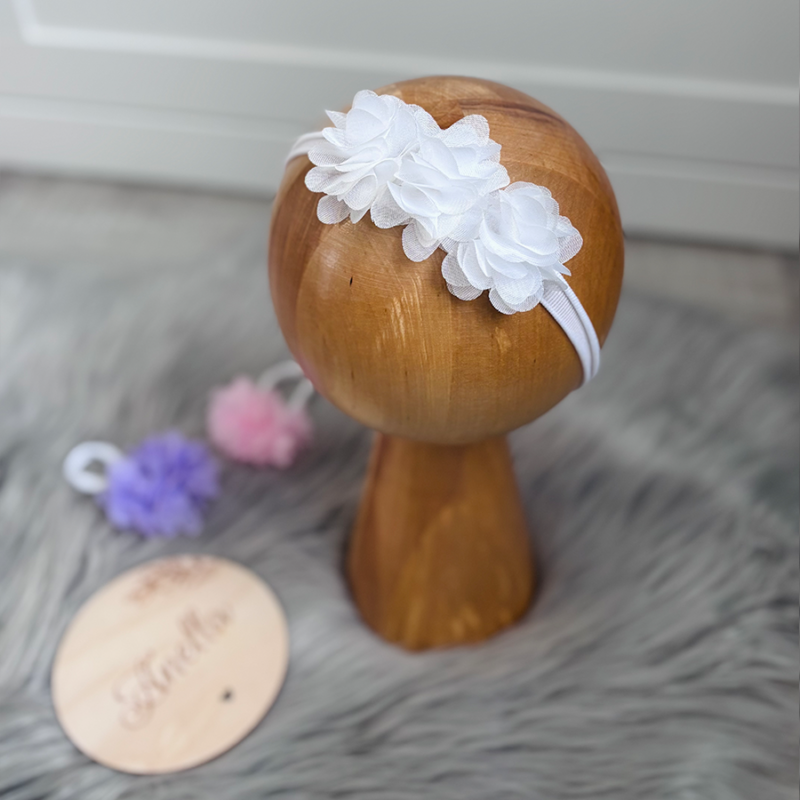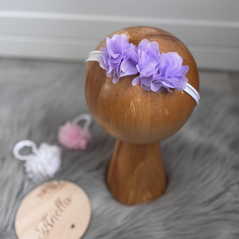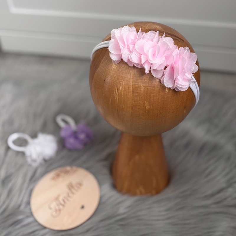 Opaska z kwiatuszkami na bezuciskowej tasiemce. Kwiatuszki do wyboru w kolorze białym, liliowym bądź pudrowym różu.