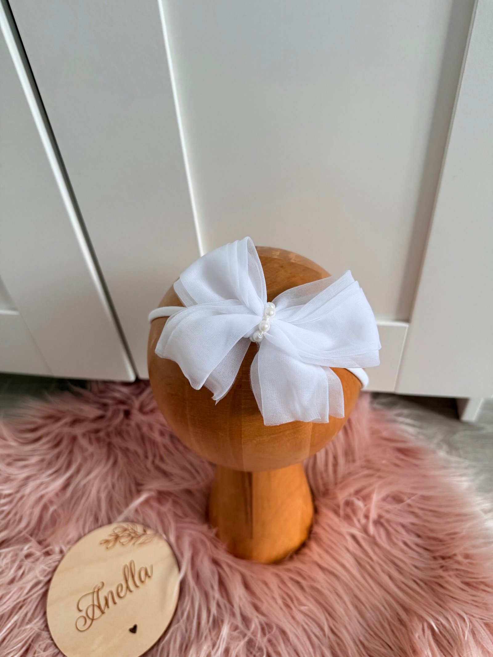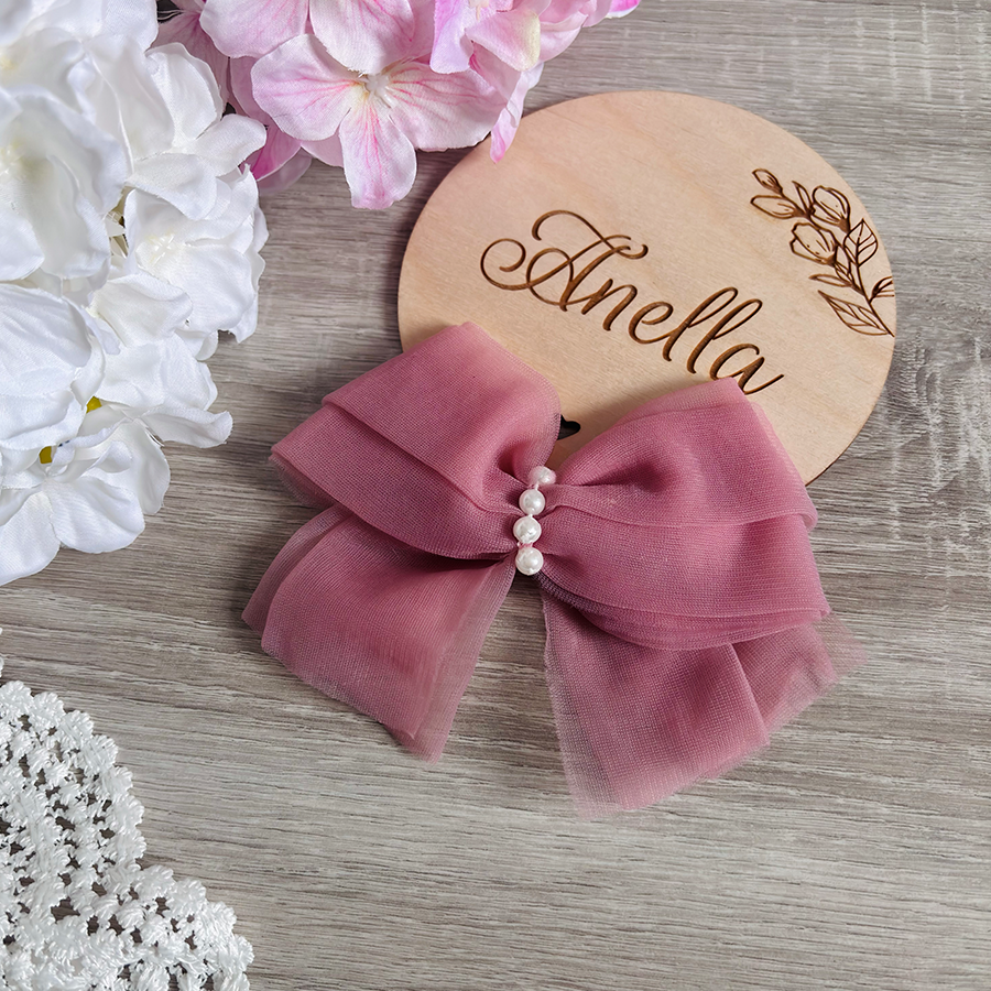 Tiulowa kokardka do wyboru: opaska na bez uciskowej tasiemce lub spinka. Ozdobiona dodatkowo pere艂kami.聽