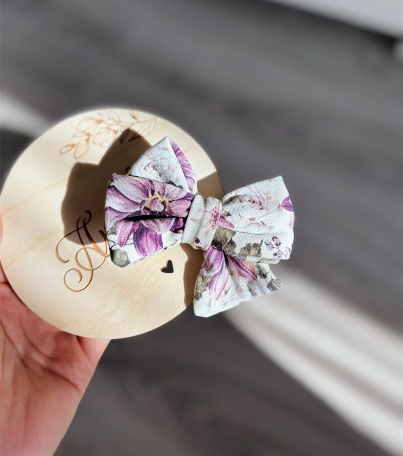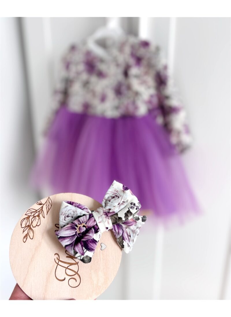 Dzianinowa kokardka do wyboru: opaska na bez uciskowej tasiemce lub spinka. Idealnie pasuje do modeli sukienek: Dalia.