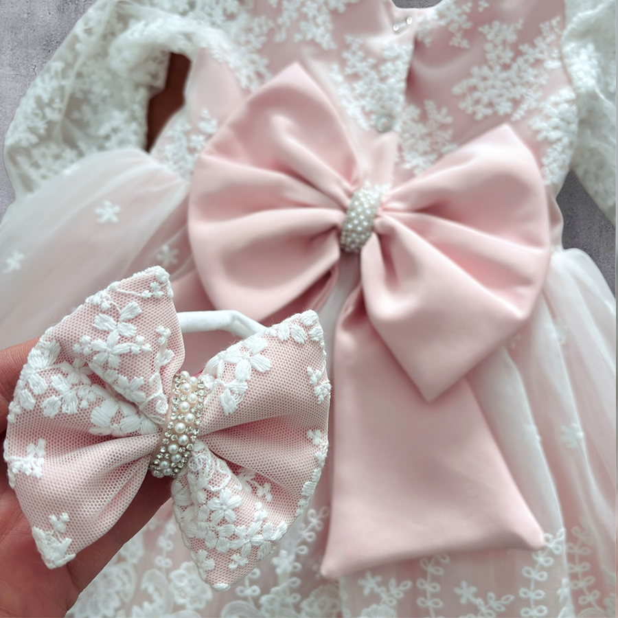 Kokardka do wyboru: opaska na bez uciskowej tasiemce lub spinka, ozdobiona dodatkowo pi臋knym b艂yszcz膮cym zdobieniem. Mo偶liwo艣膰 uszycia opaski w kolorze: 艣mietanka, be偶, pudrowy r贸偶 (na zdj臋ciu) lub brudny r贸偶.聽