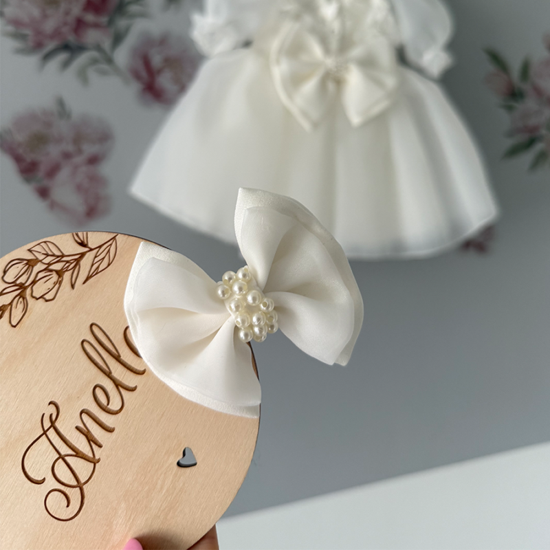 Podwójną kokardka Marietta ozdobiona perełkami – do wyboru opaska na bezuciskowej tasiemce lub spinka. Kolor kokardki śmietanka.