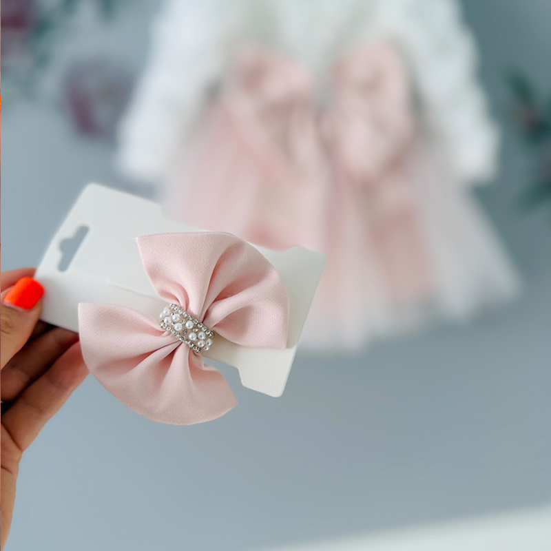 Kokardka jest uszyta z tej samej tkaniny co kokarda przy sukience aby idealnie pasowała do zestawu.