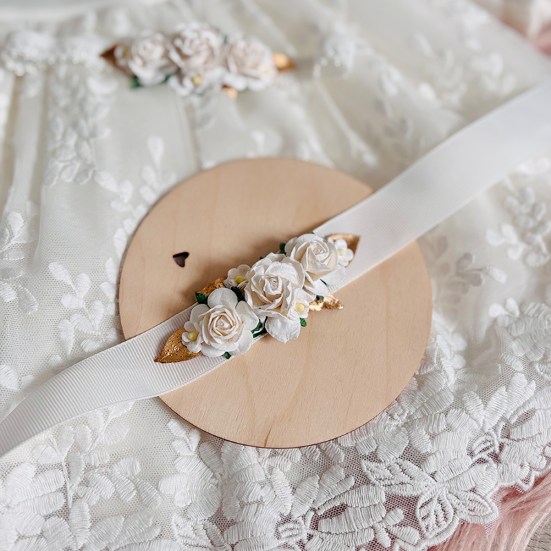 Pasek z kwiatuszkami ze złotymi zdobieniami na rypsowej tasiemce. Kwiatuszki są papierowe.