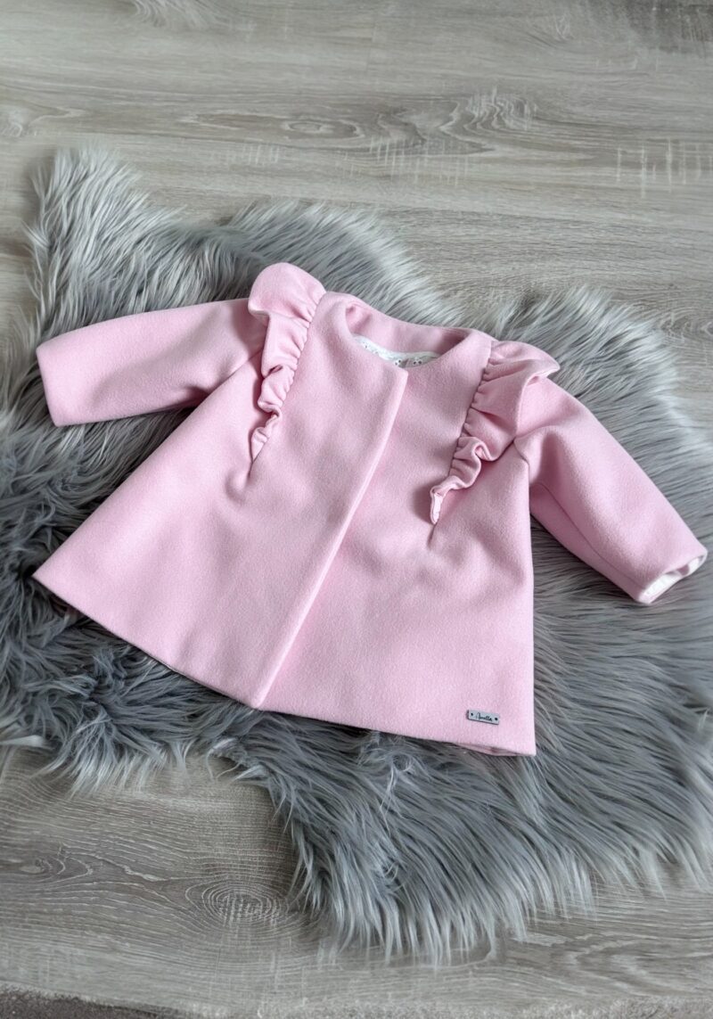 Płaszczyk z falbankami przejściowy (bez ocieplenia) w kolorze pudrowego różu. Zapinany na 2 zatrzaski. Tkanina z miękkiego flauszu z wełną, w środku podszewka w kolorze białym.