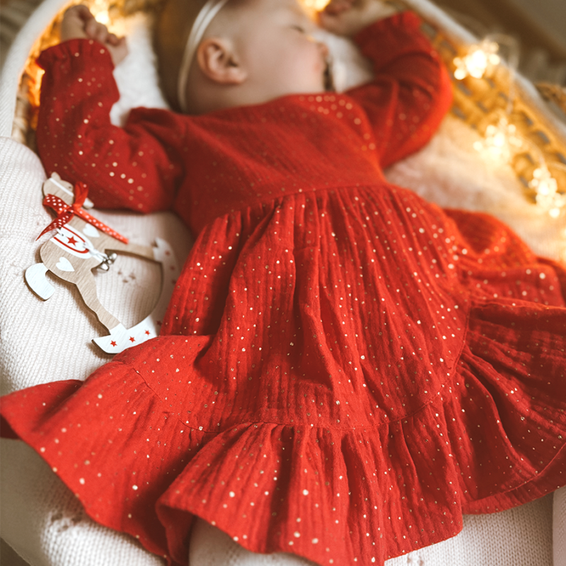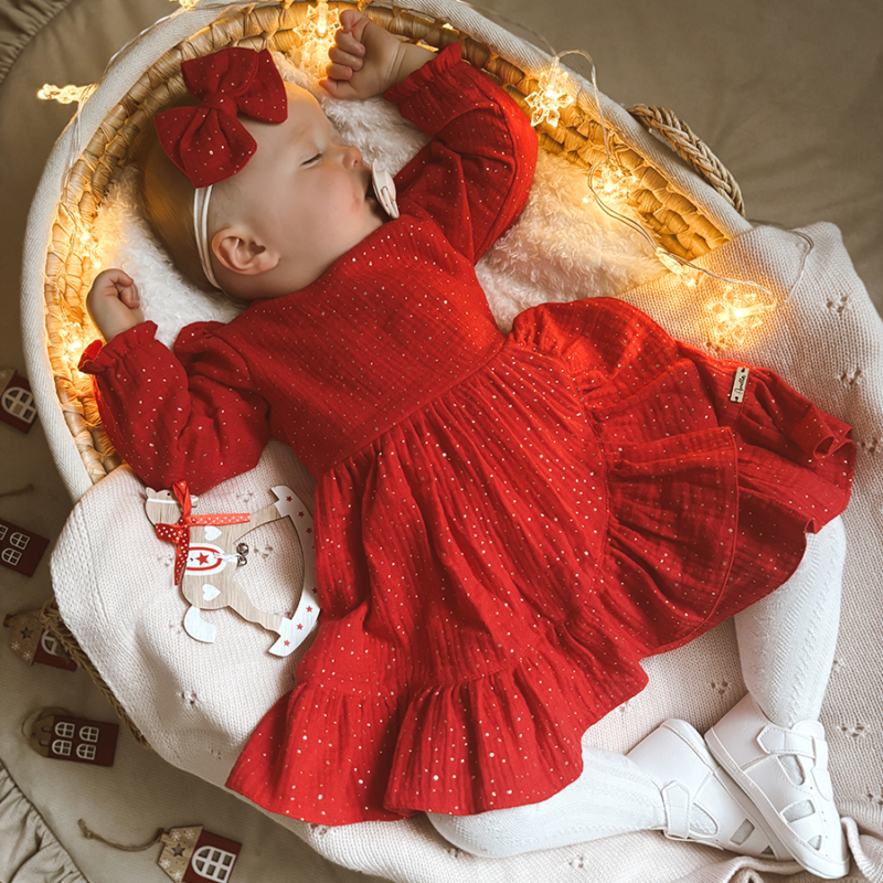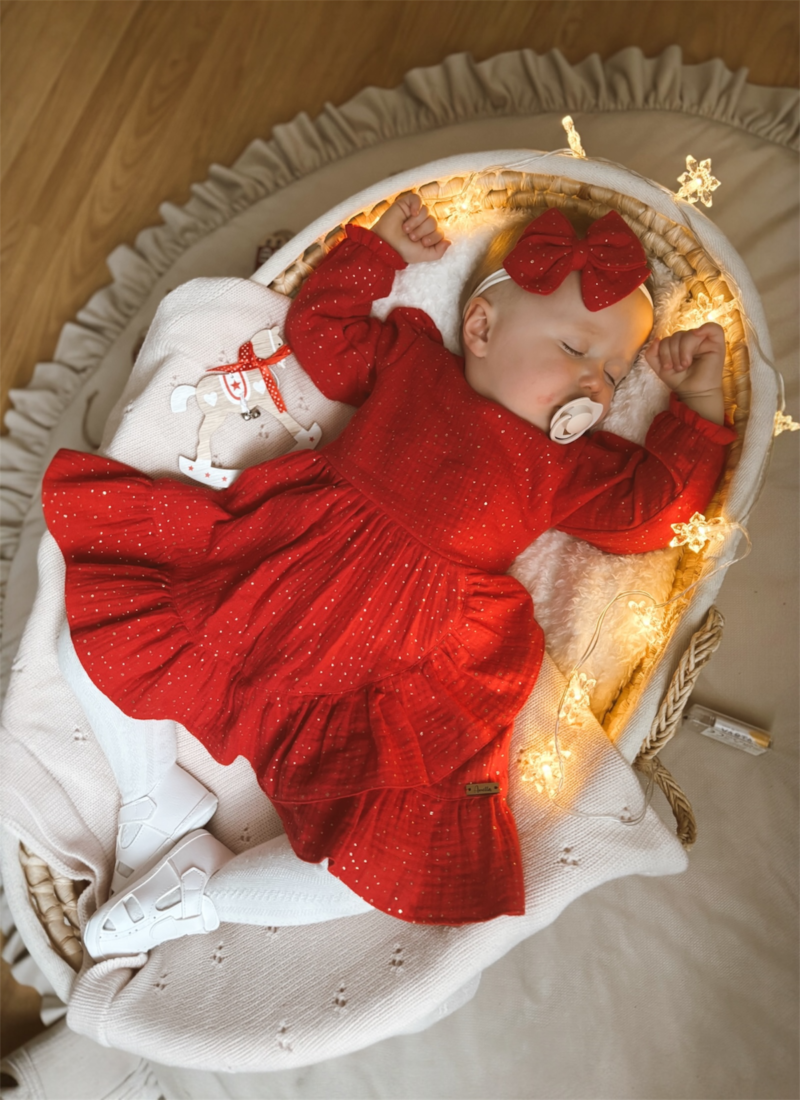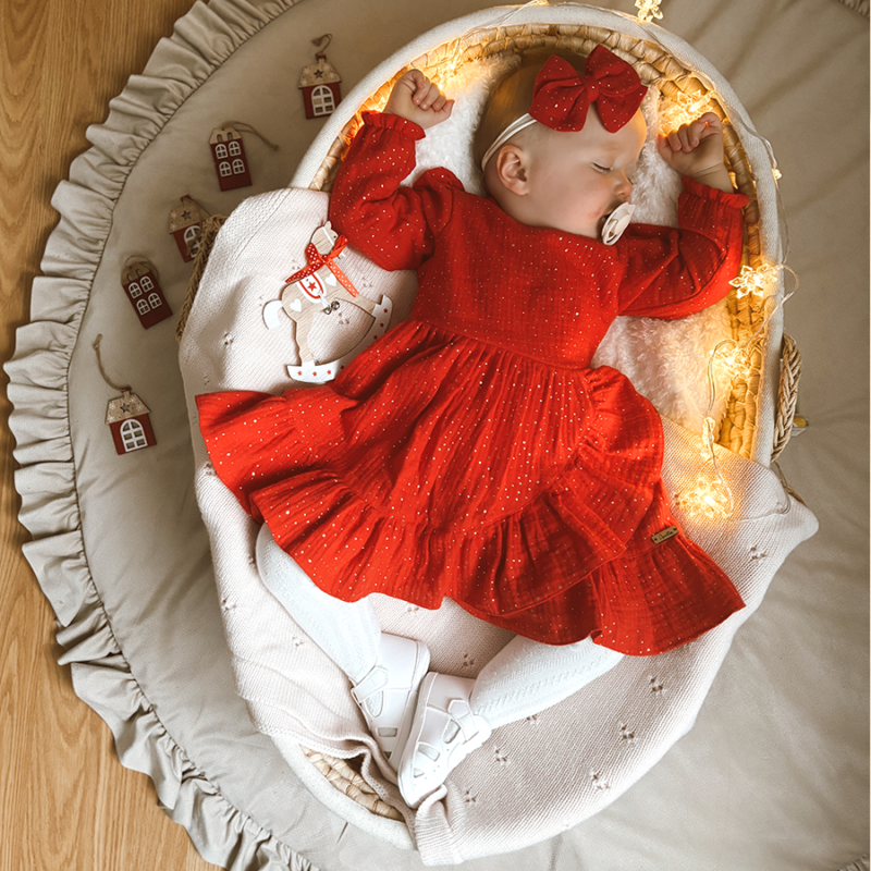 Sukienka Ariel IV w pięknym czerwonym kolorze w delikatne złote kropeczki, będzie idealnym wyborem na świąteczne stylizacje. Na przodzie ma ozdobną falbankę. Uszyta z miękkiego muślinu bawełnianego. Rękaw do wyboru: krótki lub długi. W zakładce akcesoria można dobrać pasujące dodatki.