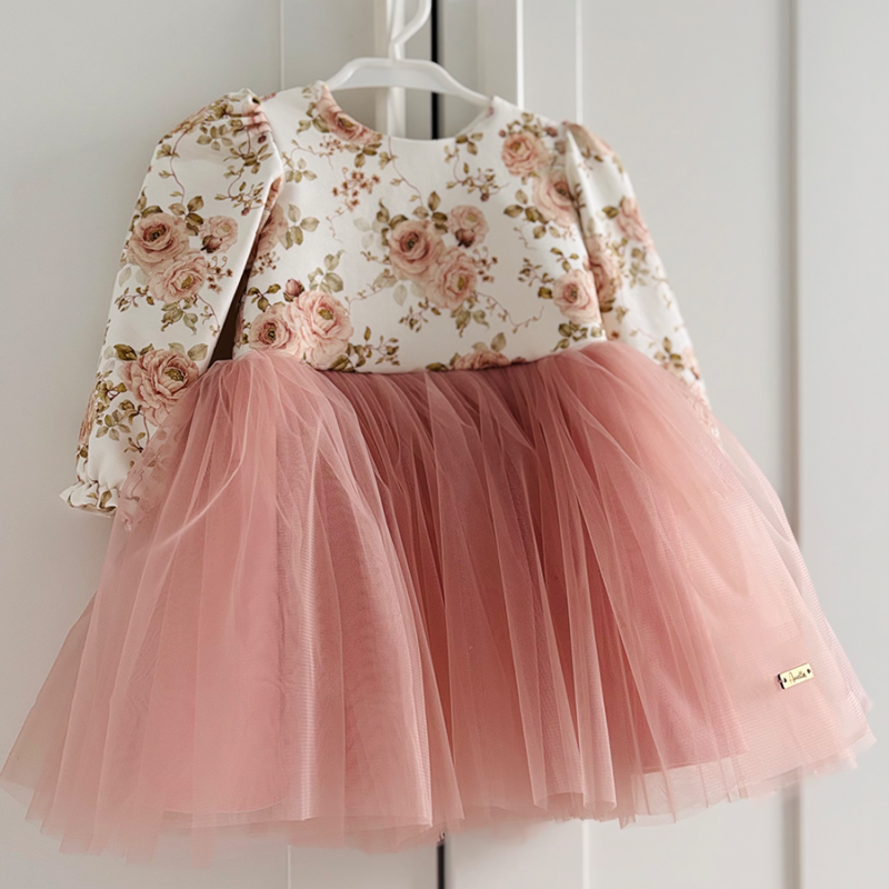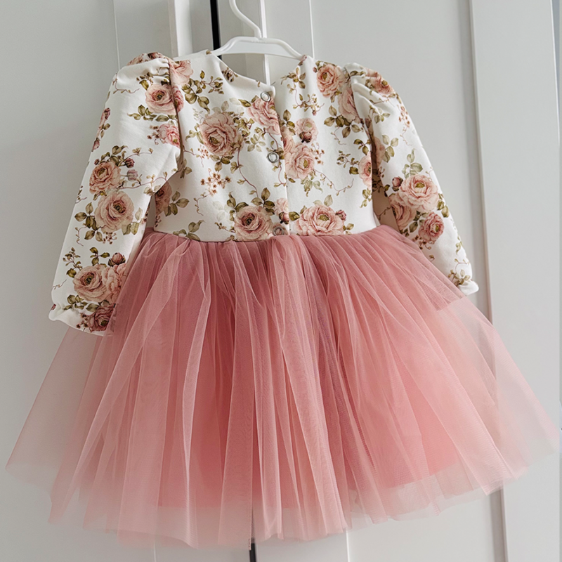 Sukienka Emilia III w odcieniach jasnego brudnego różu. Góra z miękkiej dzianiny dresówki , dół z kilku warstw lekkiego tiulu.