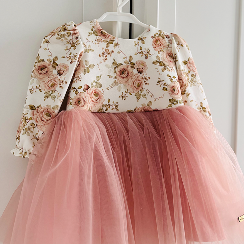 Sukienka Garden z pewnością wszystkich zachwyci na takiej uroczystości jak urodziny czy wesele. Góra z dzianiny dresówki i kilku warstw tiulu. Perełki są fabrycznie nabite na metalowy bolec. Możliwość uszycia również w wersji letniej – bez długiego rękawa z samymi motylkami. Sukienkę możesz ozdobić dużą kokardą z tyłu (wtedy doszyta na stałe) oraz dobrać pasującą opaskę/spinkę (w zakładce Akcesoria). Kolor sukienki – śmietanka i pudrowy róż.