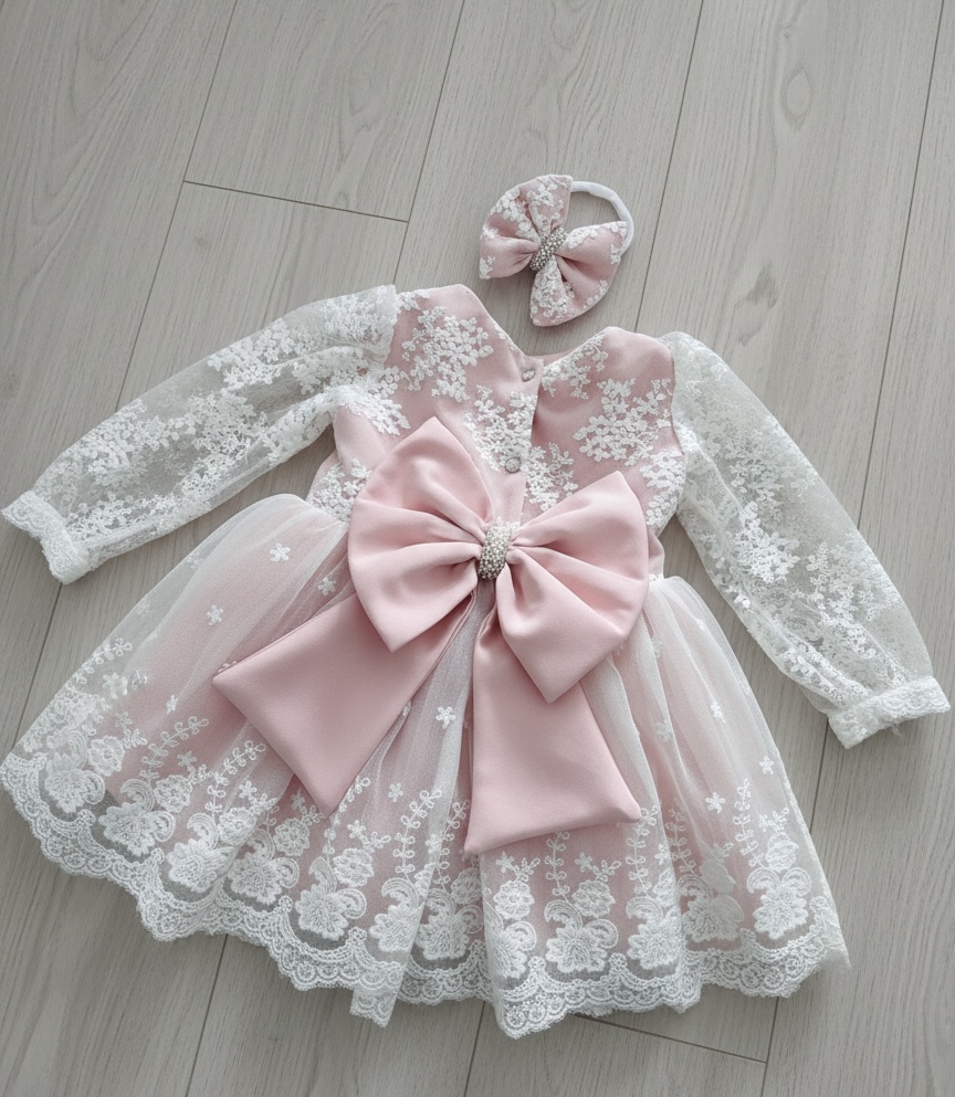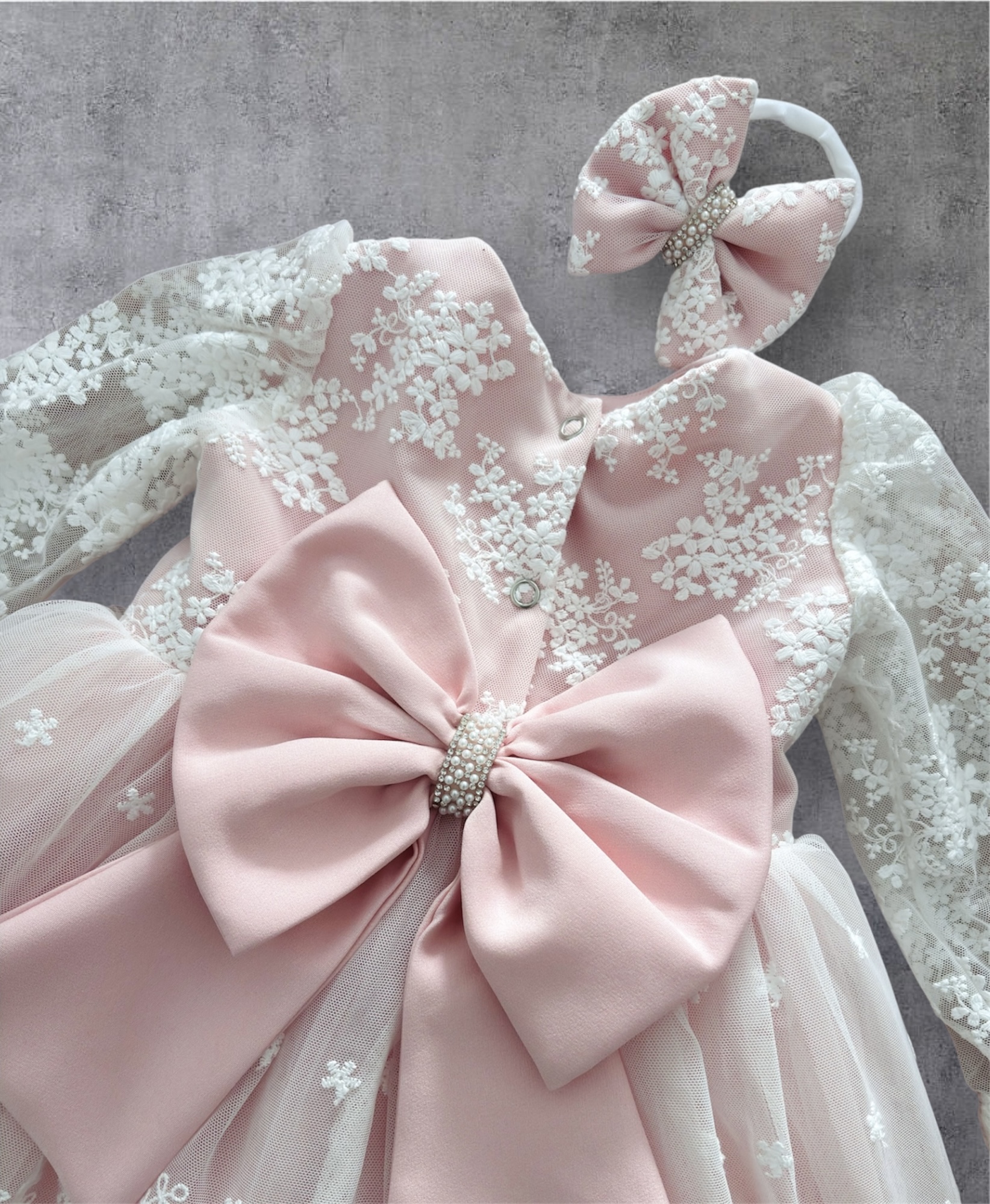 Sukienka Emma II to zjawiskowy fason na wyjątkową uroczystość jak chrzest czy roczek. Uszyta z miękkich tkanin i bawełnianej koronki. Pod koronką są dodatkowo warstwy miękkiego tiulu.  Do wyboru krótki lub długi rękaw (nie jest podszyty tkaniną). Kolor sukienki pudrowy róż, koronka w kolorze śmietanki.