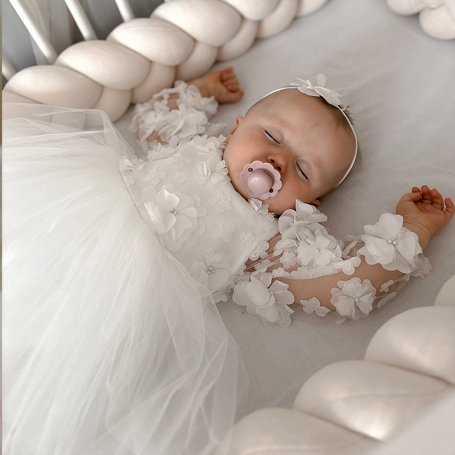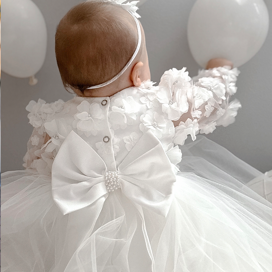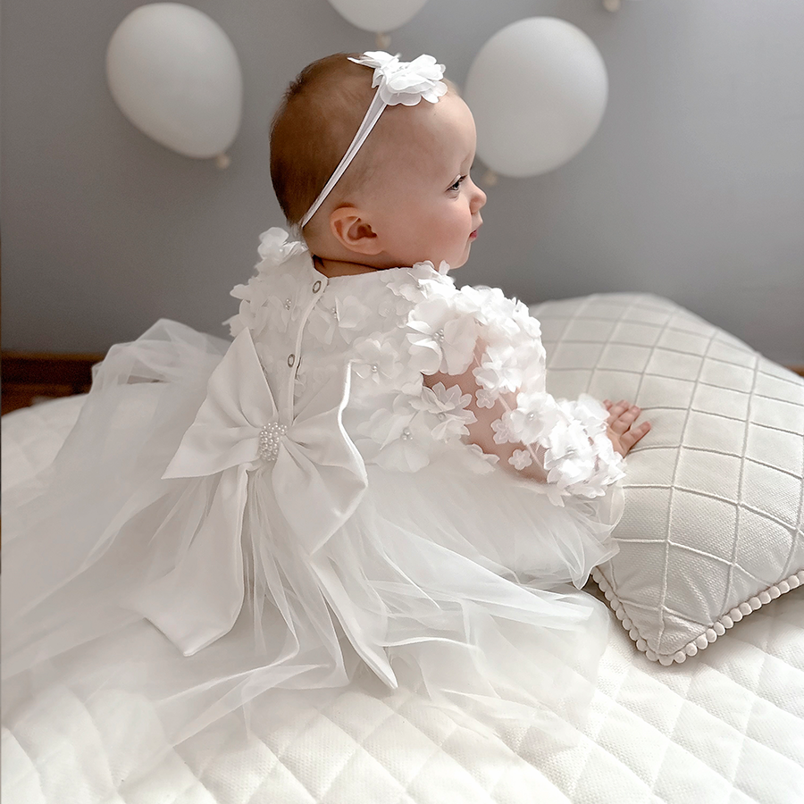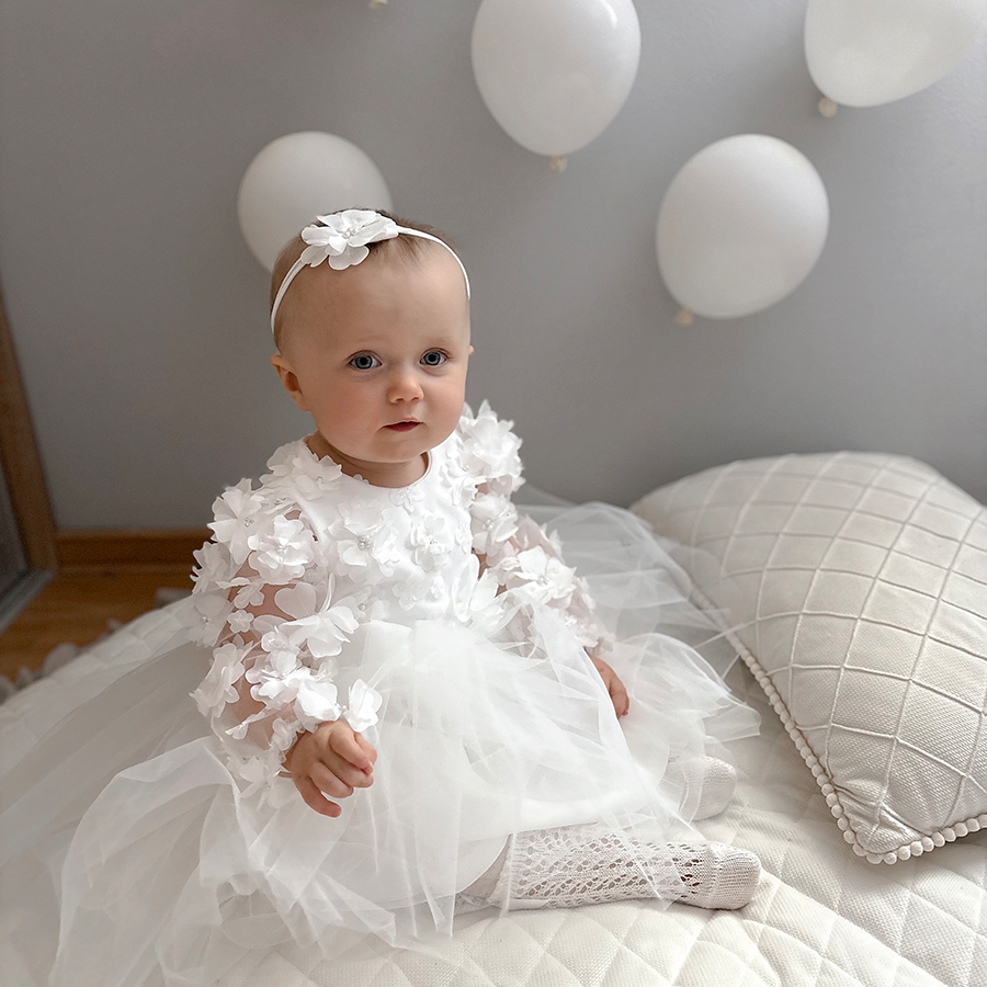 Zjawiskowa sukienka Florence z pewnością zachwyci na każdej wyjątkowej uroczystości. Góra z pięknymi zdobionymi kwiatami 3D, rękawki układają się w bufki, dół z kilku warstw miękkiego tiulu. Kokarda dodatkowo ozdobiona pięknymi perełkami. Możliwość zamówienia z kokardą lub bez – przy domówieniu kokardy jest ona doszyta na stałe.