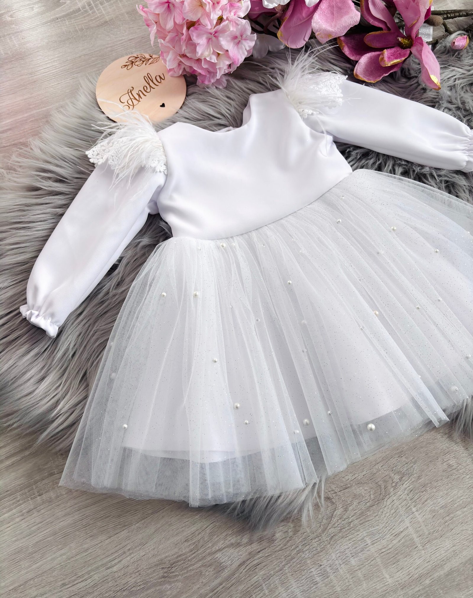 Sukienka Perełka to idealna propozycja na taką uroczystość jak chrzest czy roczek. Uszyta z miękkiej tkaniny, miękkiego i lekkiego tiulu z perełkami. Perełki są fabrycznie nabite na metalowy bolec. Rękaw do wyboru: same motylki lub motylki + długi rękaw.