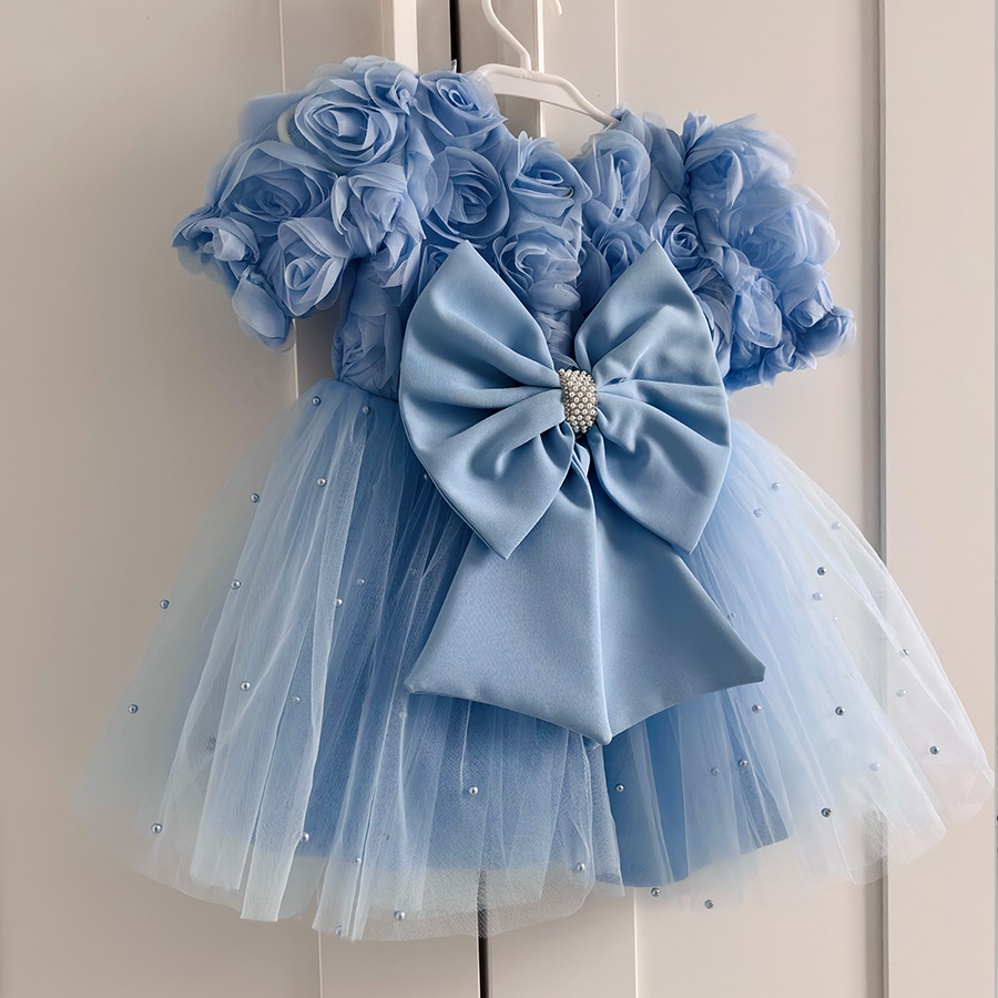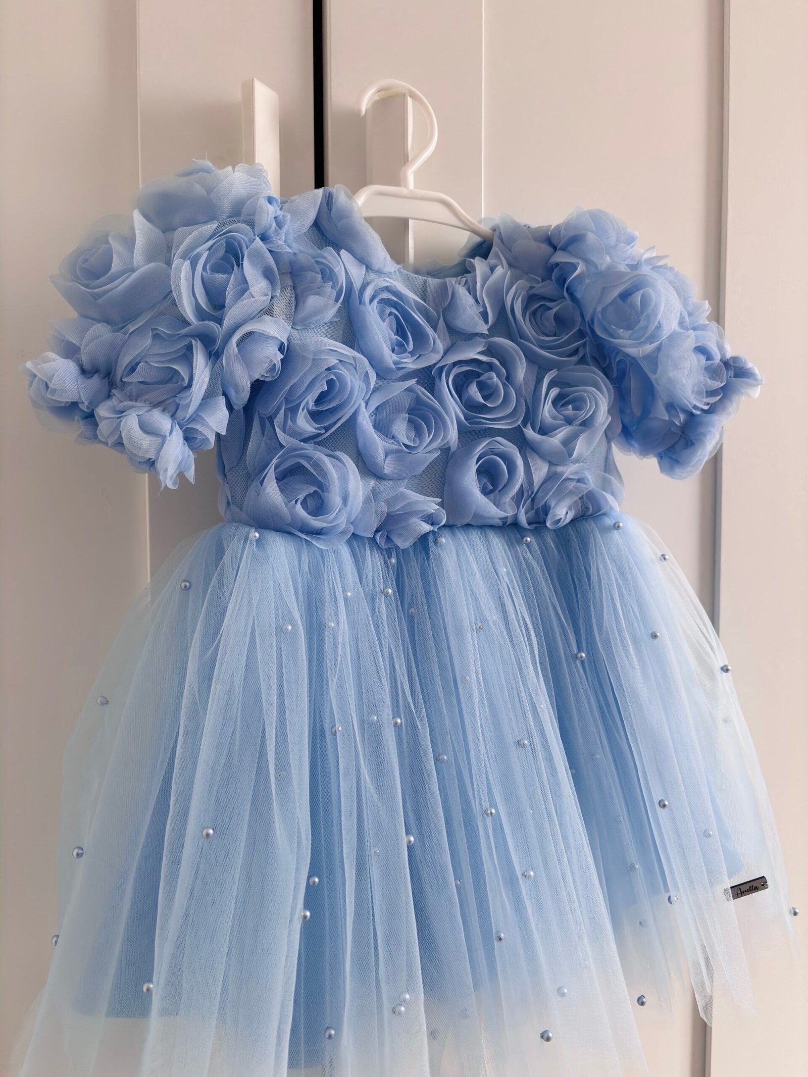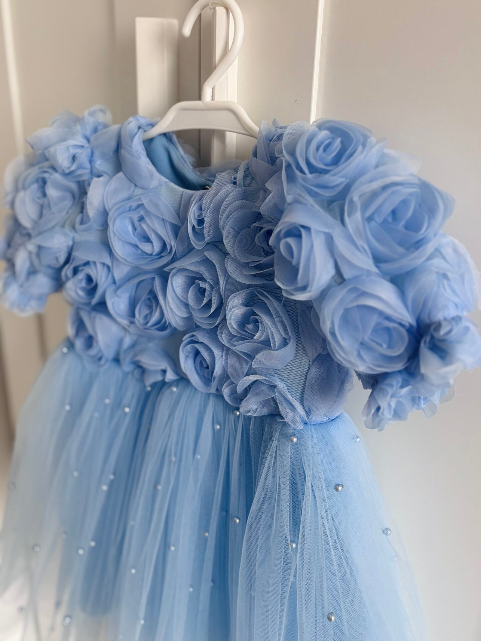Sukienka Rosalia to zjawiskowy fason na każdą wyjątkową uroczystość. Góra z pięknej i miękkiej tkaniny z różami 3d, dół z kilku warstw rozłożystego tiulu, wierzchnia warstwa z delikatnymi perełkami. Możliwość uszycia z krótkim lub długim rękawem. Sukienkę można ozdobić piękną kokardą z tyłu. Przy domówieniu kokardy jest ona doszyta na stałe. Kolor sukienki – błękit.