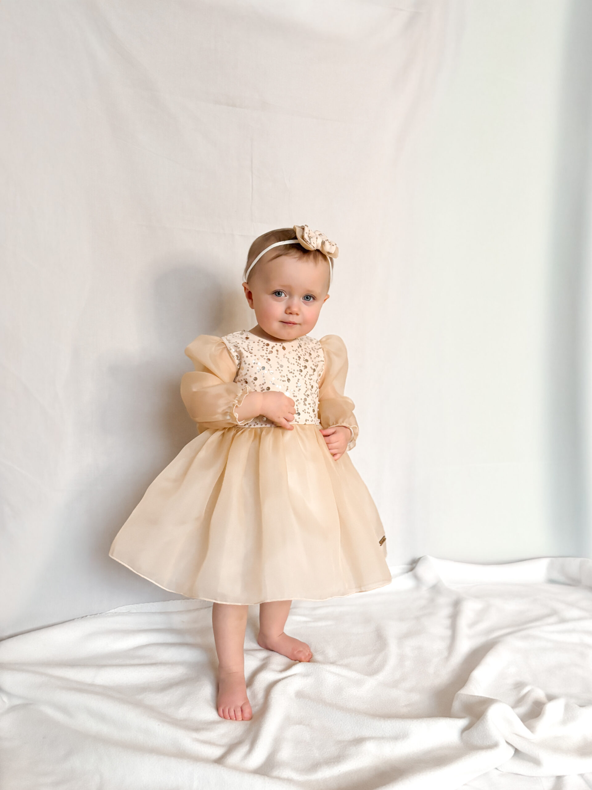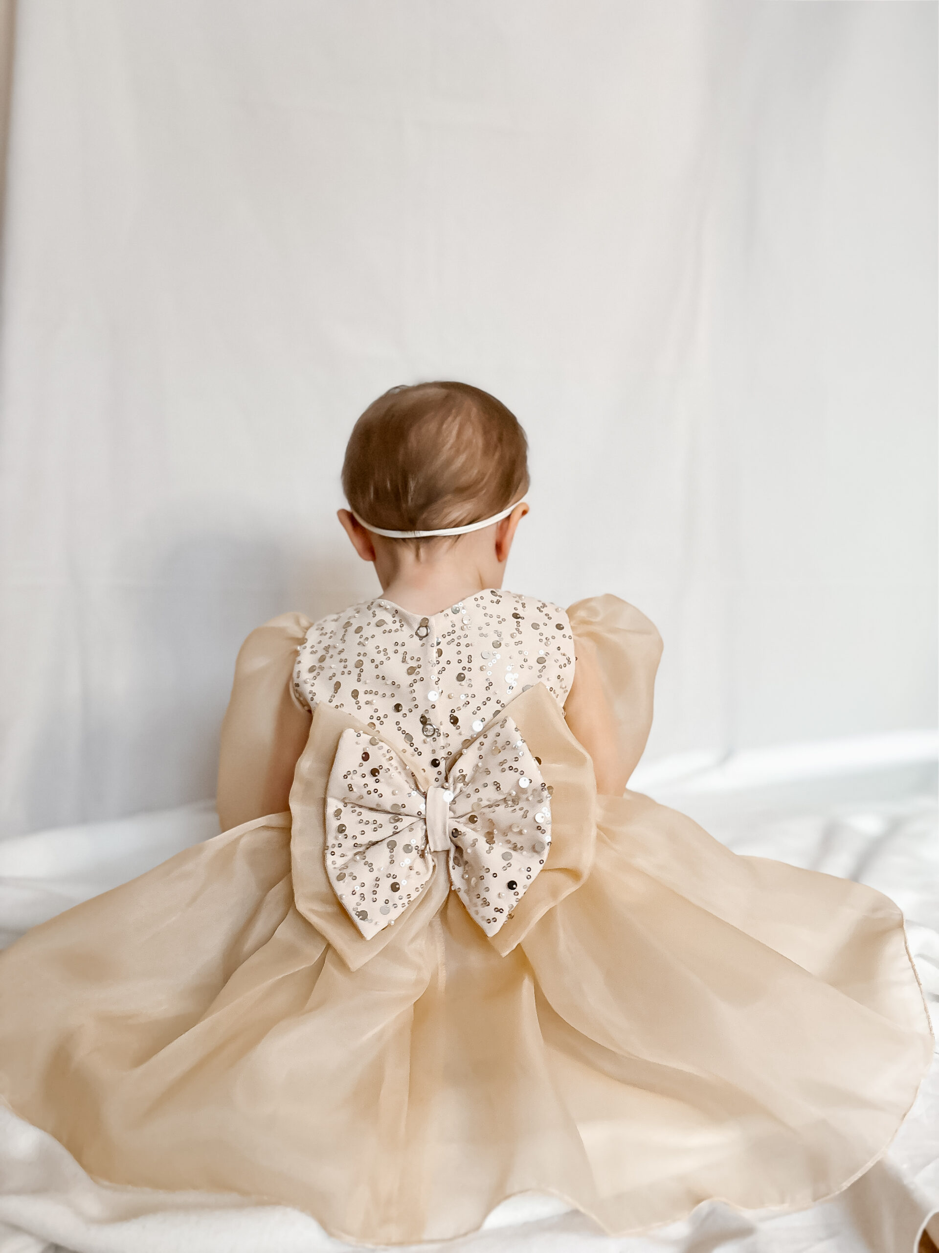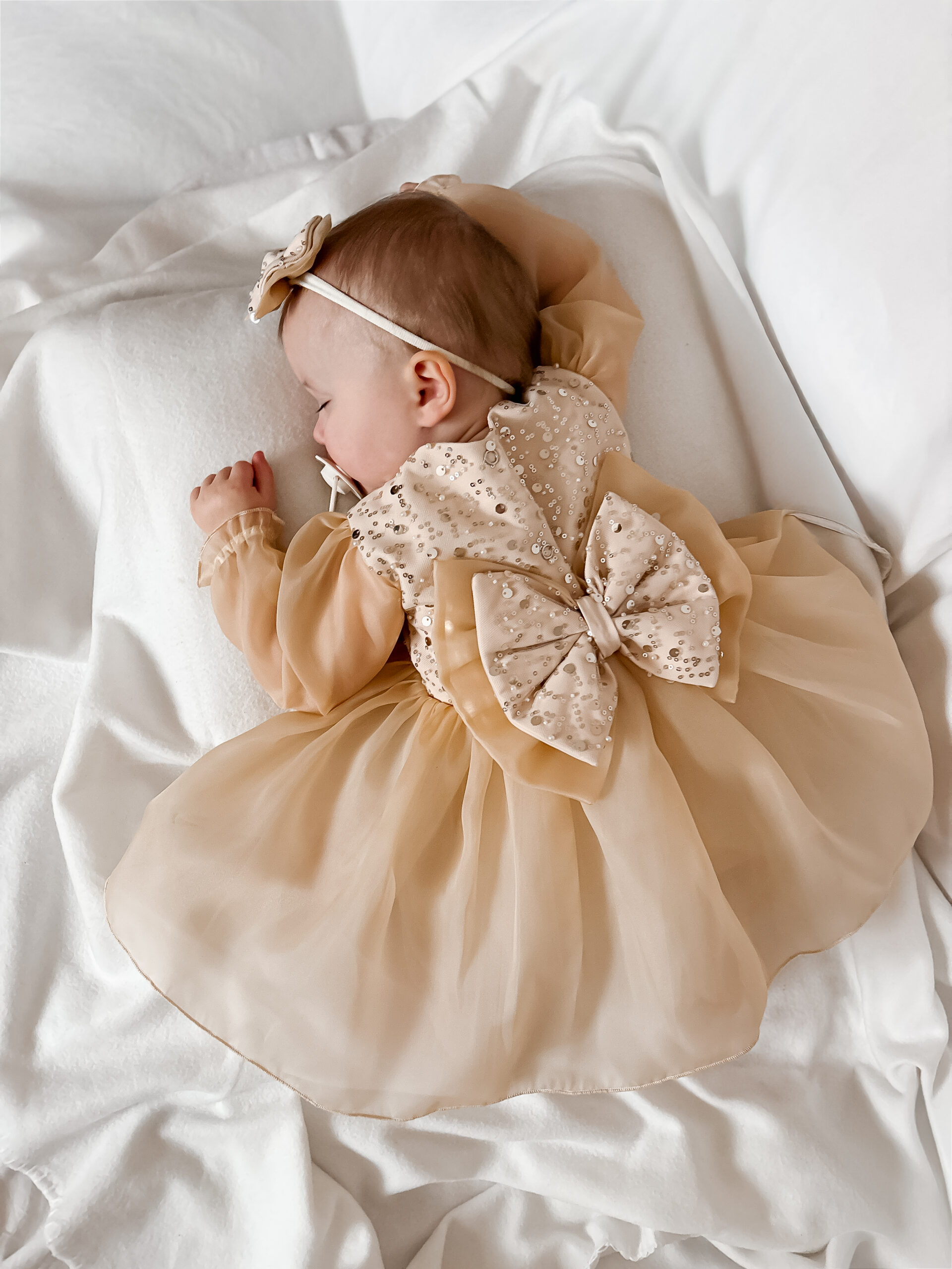 Sukienka Scarlett ze zdobioną cekinową górą, bufiaste rękawy oraz spódniczka uszyte z wysokiej jakości organzy, przy rękawach gumeczki. Spódniczka pod organzą ma dodatkowo warstwy miękkiego tiulu, jest rozłożysta. Sukienka w kolorze bladego złota.