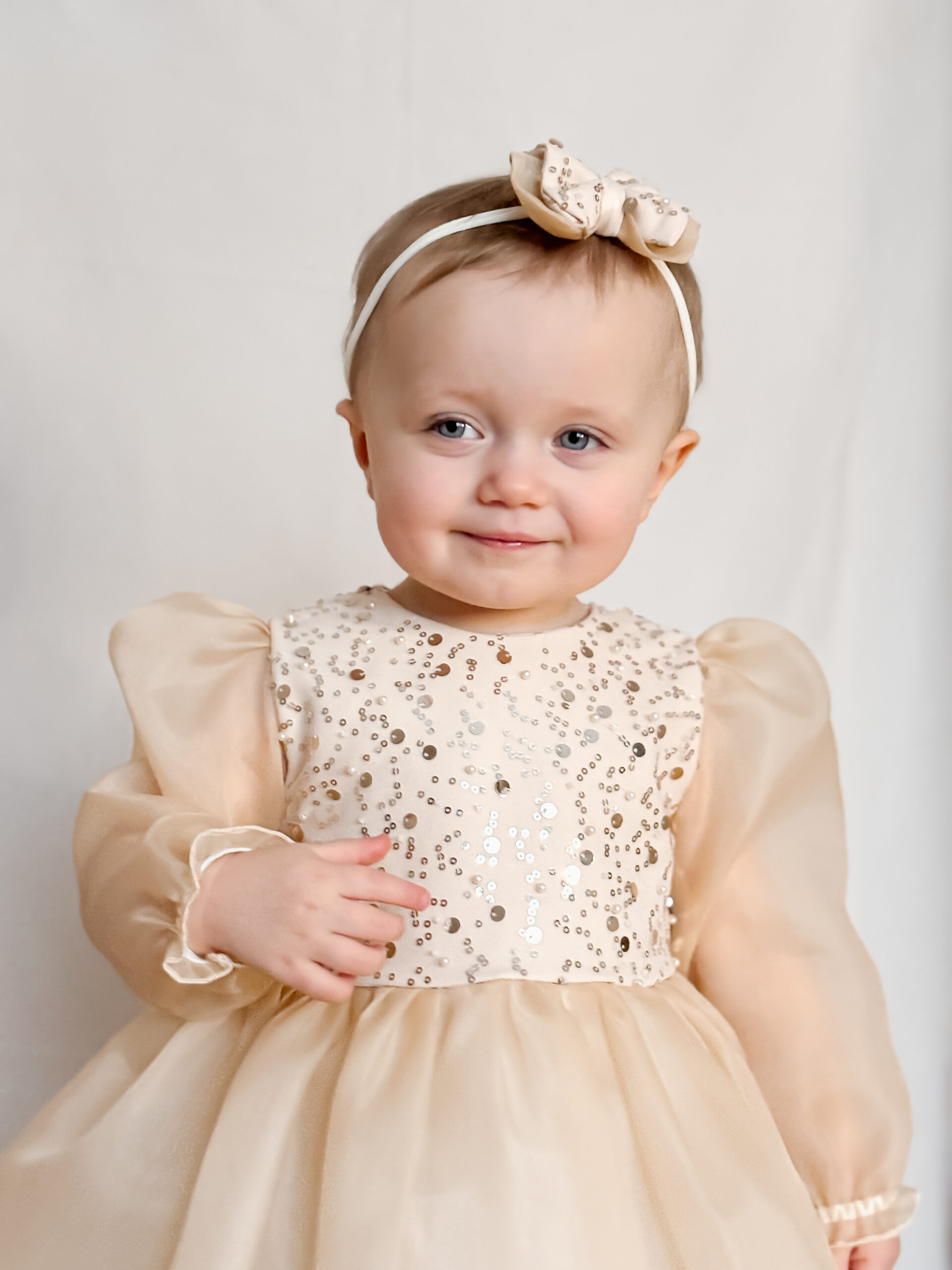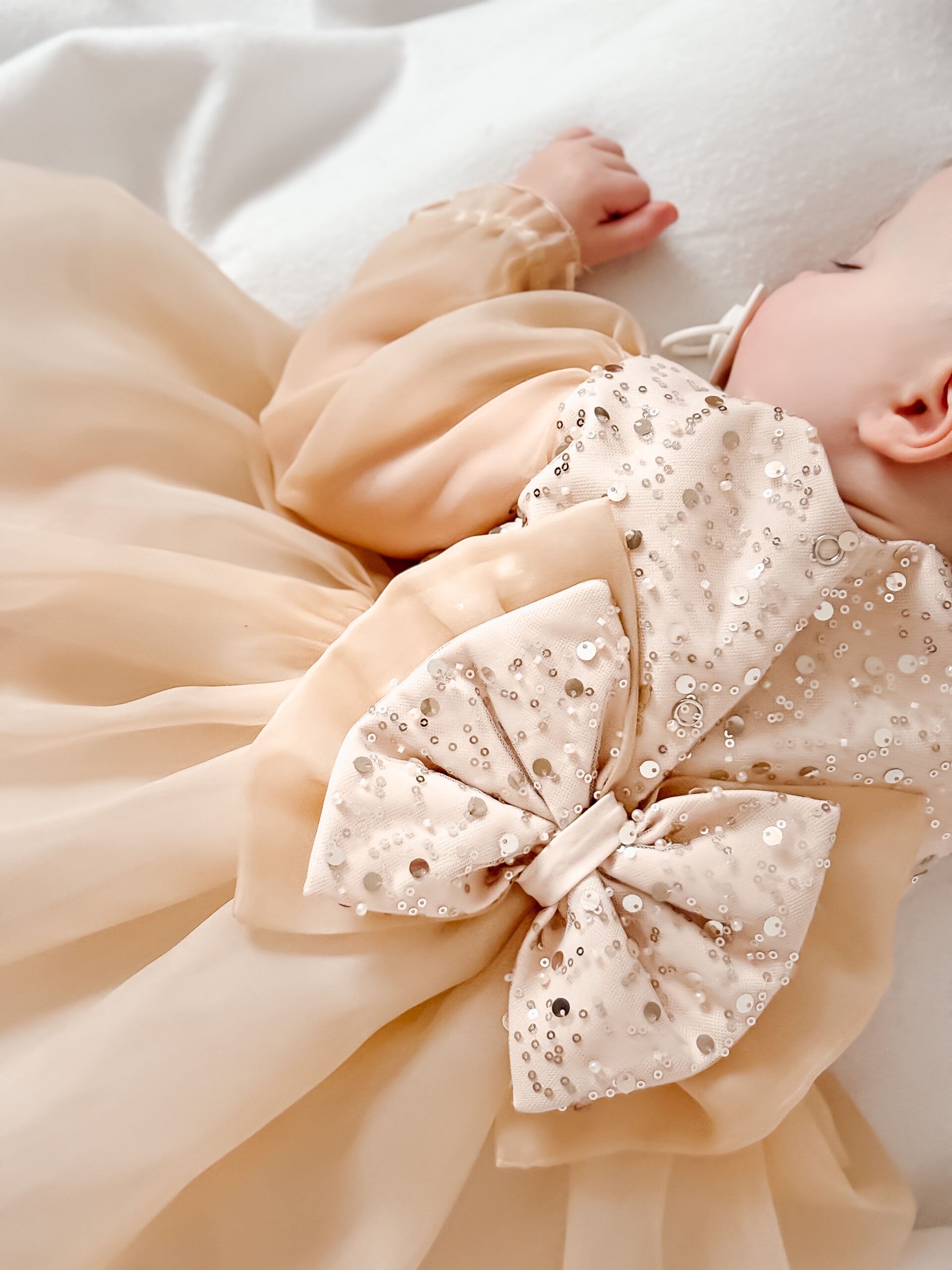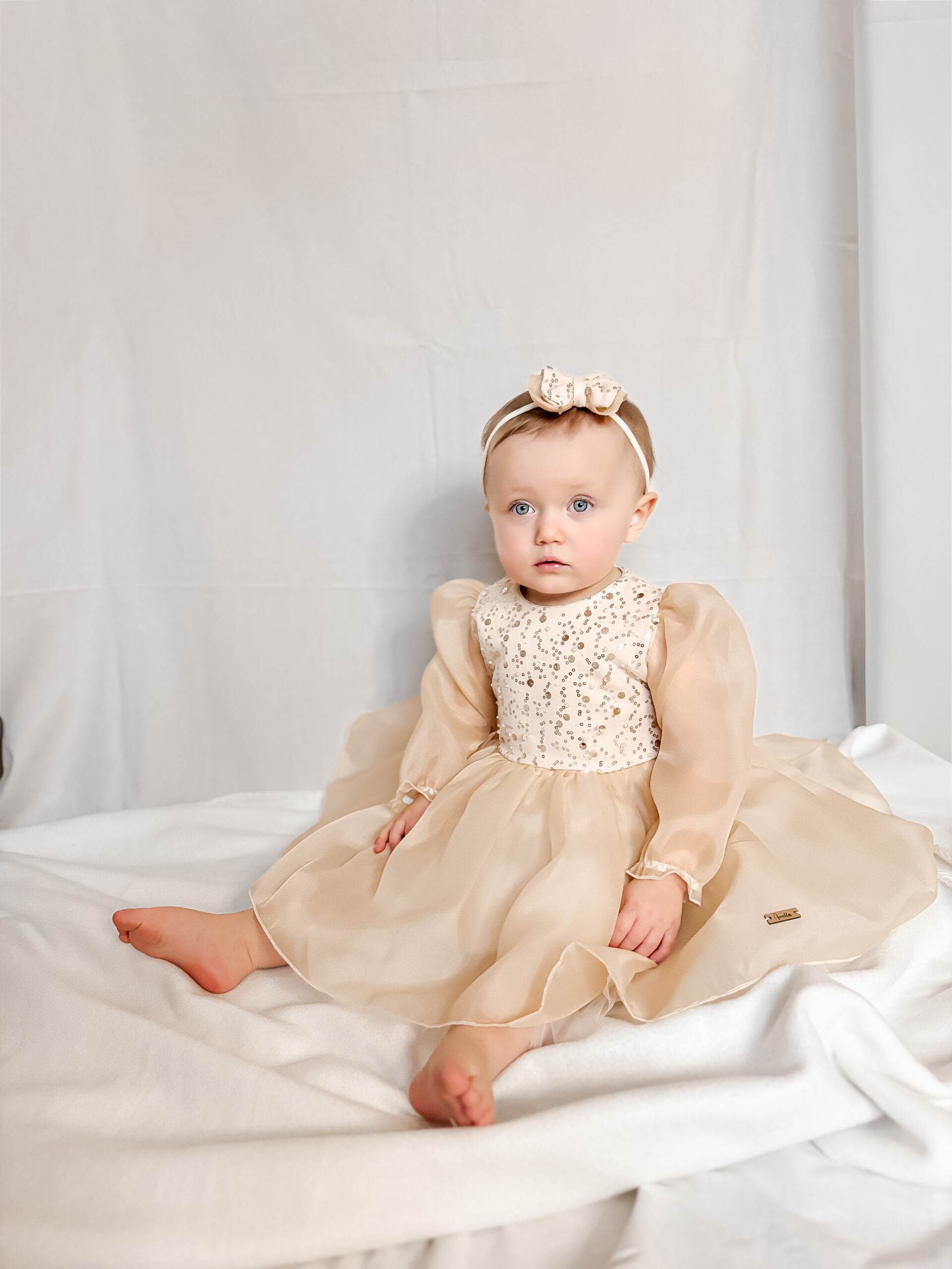 Sukienka Scarlett ze zdobioną cekinową górą, bufiaste rękawy oraz spódniczka uszyte z wysokiej jakości organzy, przy rękawach gumeczki. Spódniczka pod organzą ma dodatkowo warstwy miękkiego tiulu, jest rozłożysta. Sukienka w kolorze bladego złota.