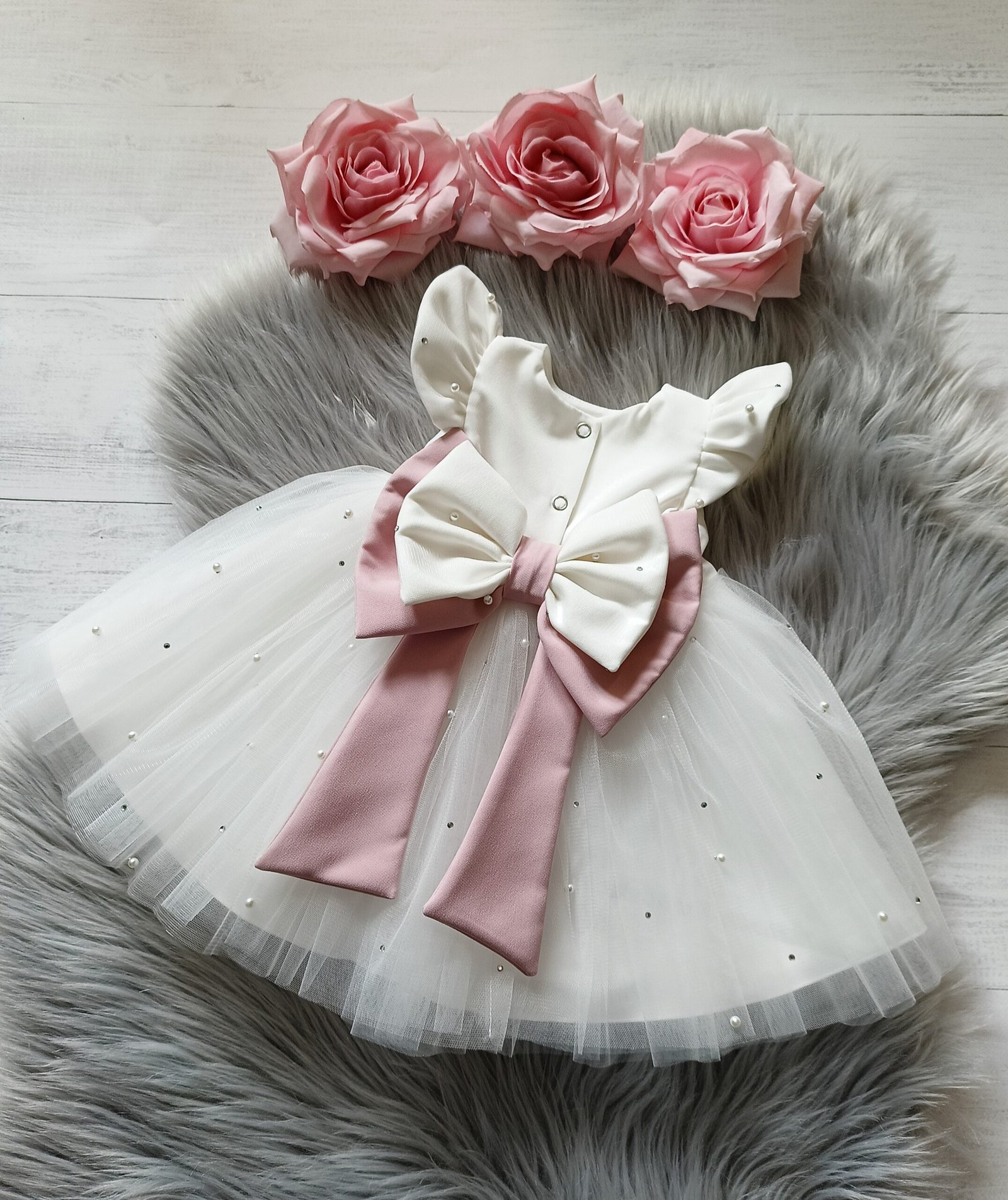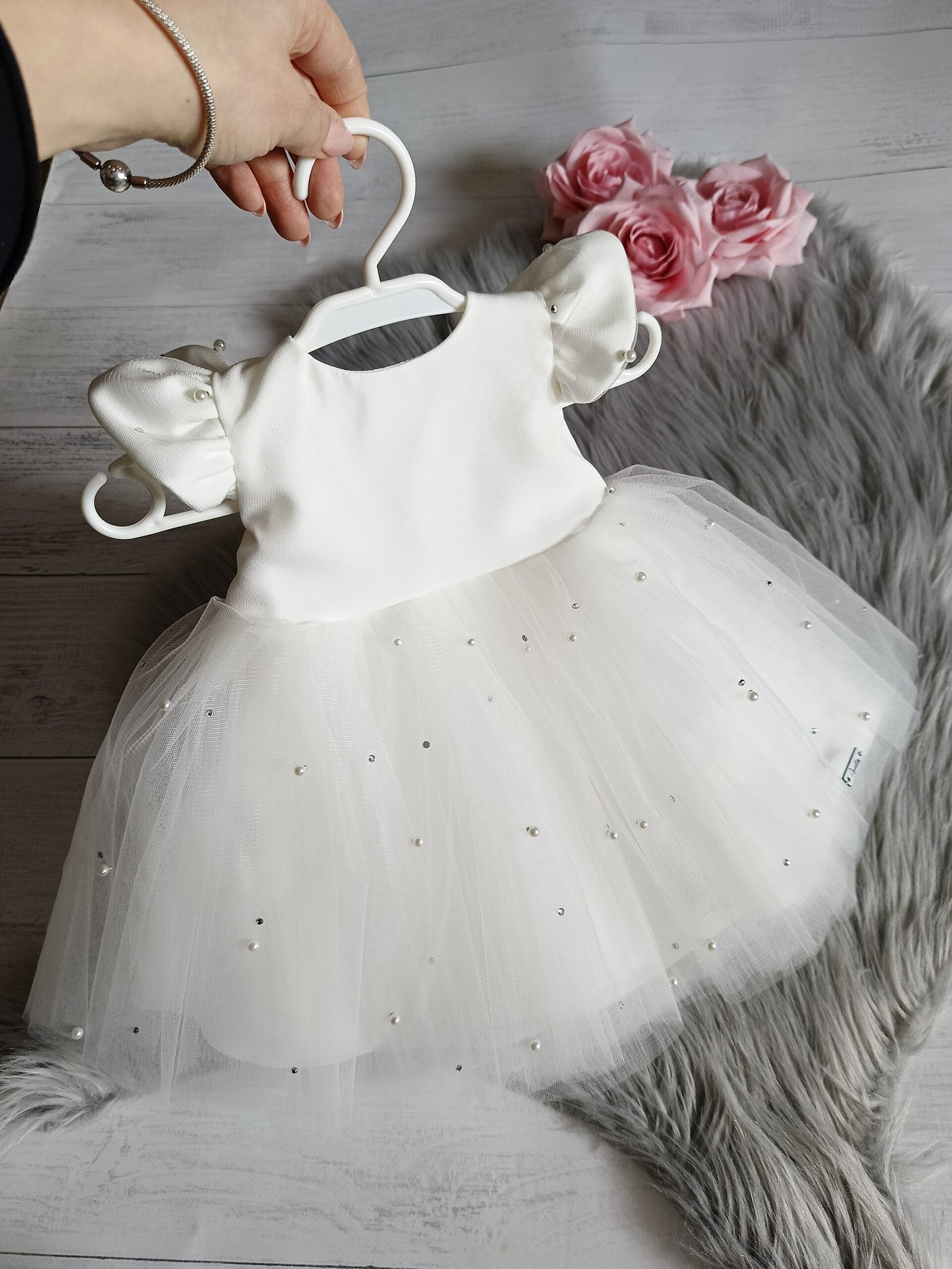Sukienka Shine II w kolorze śmietanki będzie idealna na ważną uroczystość jak chrzest. Uszyta z miękkiej tkaniny i lekkiego tiulu dodatkowo zdobionego perełkami oraz diamencikami. Możliwość uszycia również z długim rękawem. Kokarda jest doszyta na stałe.